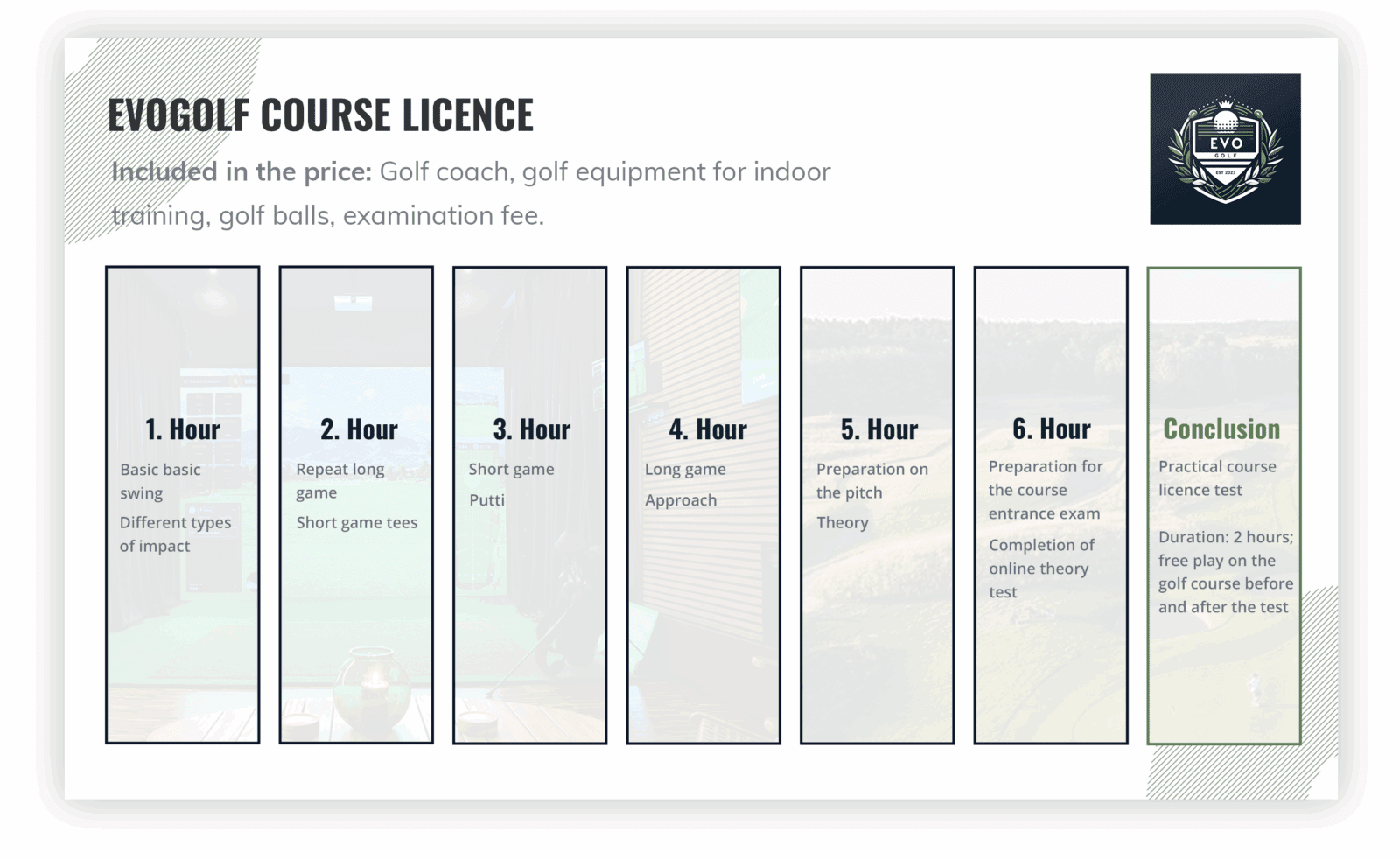 - 5 additional indoor training sessions with coaches at EvoGolf (recommended over 2–3 days)